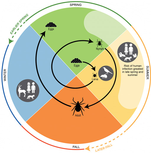 Climate change is not just the global change in climate and the increase in atmospheric temperature. Climate change can create diverse health issues for many different people. According to Samantha Harrington at Yale University, the raise in global temperature causes disease-carrying insects, such as mosquitoes and ticks, to expand their range and activity. These insects are vectors for many different illnesses for which we can expect to see increased infections within humans. The rise in global temperature also creates a humid environment which is perfect for these insects to reproduce and increase their population size. The image below is a good depiction of how ticks are able to expand their range and activity due to global climate change. We are having earlier springs and later falls. The period in which ticks are laying their eggs is coming much sooner due to the earlier spring. Ticks are also able to live a longer life span, increasing their activity, because our winters are coming much later.